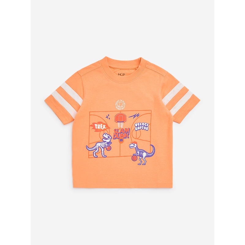 This orange t-shirt from HOP Kids showcases playful dinosaur motifs shooting hoops at the front. Crafted from a cotton-rich fabric, it is designed with a classic crew neck and short sleeves for all-day comfort.