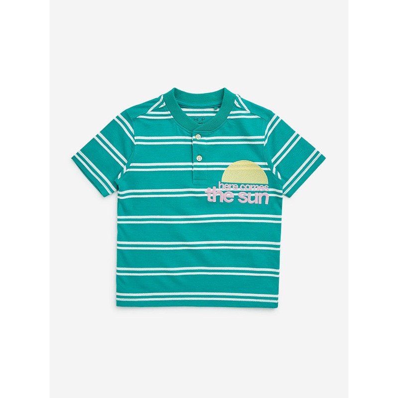 HOP Kids presents this teal striped T-shirt, designed for a blend of comfort and playful charm. Crafted from a soft cotton blend, it features an embroidered design on the front and a fun print at the back. The band neck leads to a neat two-button placket, while short sleeves complete the casual yet stylish look.