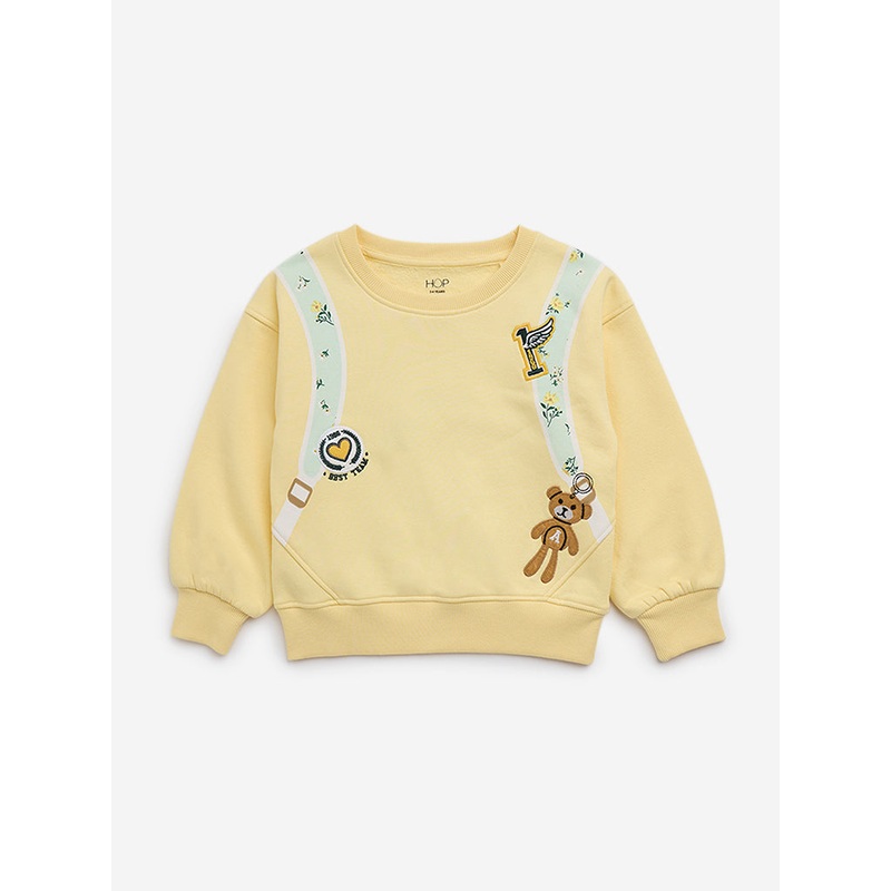 This yellow sweatshirt from HOP Kids features adorable bear appliqus and playful backpack-inspired details on the back. Made from a soft fabric, it includes full sleeves and a ribbed crew neck for a comfortable and whimsical look.