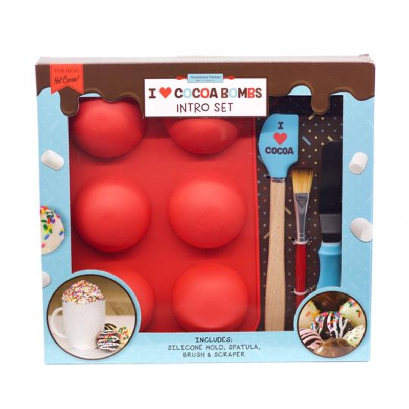 Includes: 1 Silicone Mold to Make 3 Cocoa Bombs, 1 Spatula, 1 Brush and 1 Scraper, plus QR code link to exclusive recipes and videos.