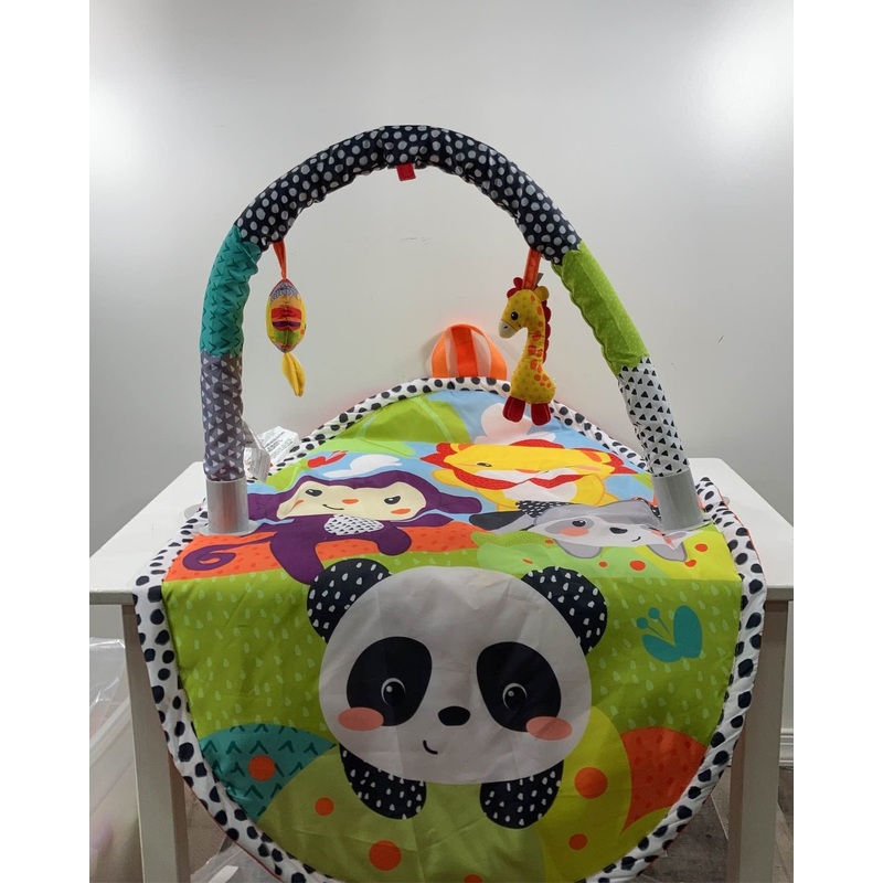 “Encourage gross motor exploration with this cute and colorful play mat. The compact size makes it easy to store and travel with. Great for small spaces or the grandparents house.”