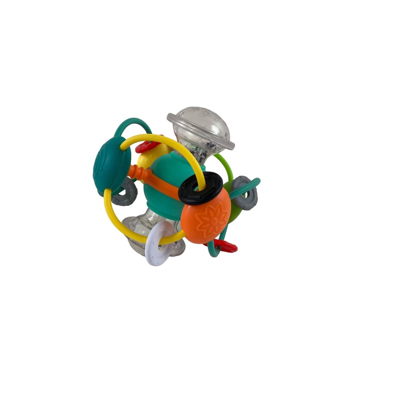“Great baby teething toy with plastic loops and rattles. Promotes clutching and two-handed play.”