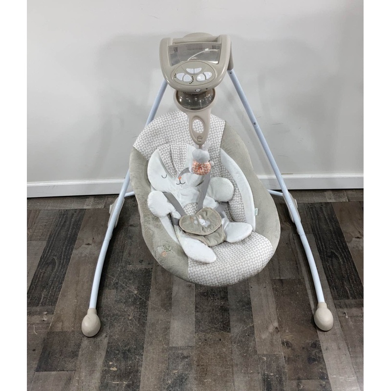“This swing is designed for newborn babies up to 9 months old or up to 20 pounds. It can be used as a swing or as a stand alone rocking seat that you can move wherever you are to easily keep an eye on baby. The swing features 6 speeds, a 2 position recline, a 180 degree rotation and gentle vibrations. Works with batteries or with an AC adapter.”