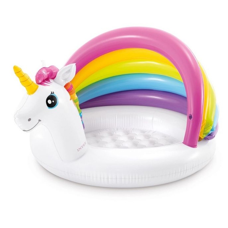 Baby will have a calm summer full of fun with this cute unicorn design Baby Pool.On a hot day, built-in shade offers additional protection from the sun.Having a soft pool floor bottom makes swimming more enjoyable.127cm x 102cm x 69cm