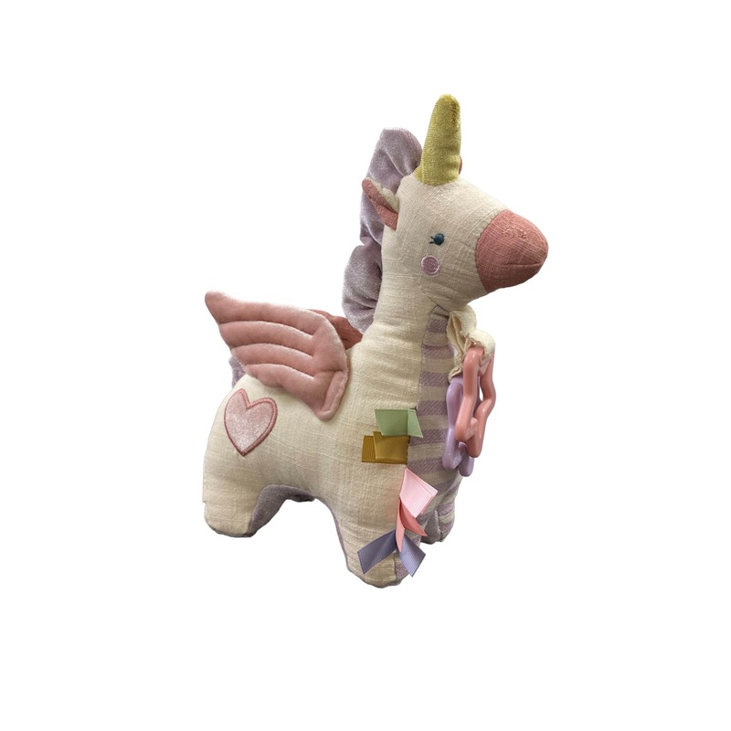 “Add this cute, fun activity toy to your car seat, stroller or play mat. Features jingle sound, crinkle fabric and soft rings.”