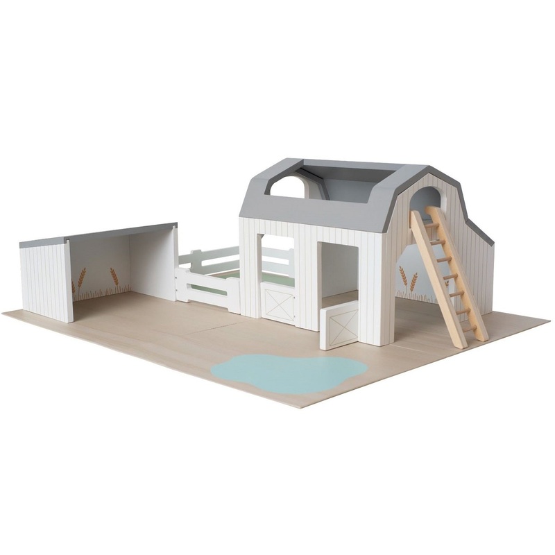 The JaBaDaBaDo Farm House comes fully assembled and ready to start using straight out of the box. The base of the farm is made of hard cardboard and is easily folded out so you can place the farm upon it. The set includes a small stable with an opening gate to keep the horses in, and in the large stable you can keep your remaining animals. There is a fence around the horse paddock so that the horses and cows do not escape. Even in the large barn you can open and close the fence. There is also a ladder so that you can go up one floor.