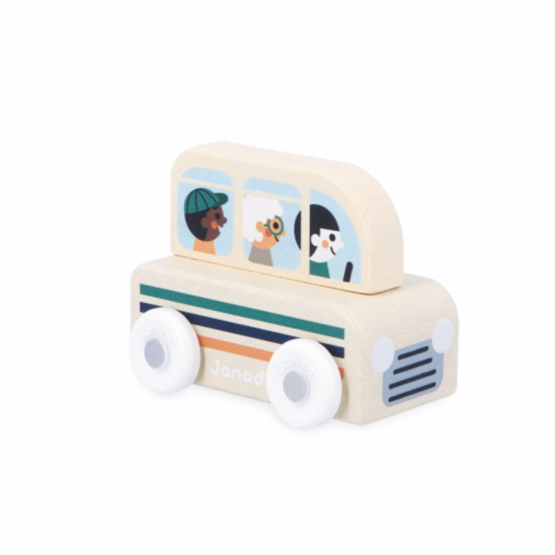 “The bus is ready to go, fasten your seatbelts!” This little wooden car is suitable for children as young as 12 months. With this pretty bus with its striped pattern, locals and tourists alike can take it to the station or the campsite! Its shape has been specially designed for little hands, who can easily hold it by the top to roll it along. The vehicles are perfect for inventing stories and developing imagination! Babies first have fun rolling them around, then older children tell all kinds of adventures, developing their vocabulary and creativity. This little Janod car is part of our Cross Roads collection: a series of playmats with circuits, made even more fun when complemented by our cube sets and small wooden vehicles. The bus is particularly suited to the Mountain Valley playmat, but can also be combined with other mats in the range. It’s made from wood from sustainably managed forests. “Wow! It’s even more beautiful than in the photos.”