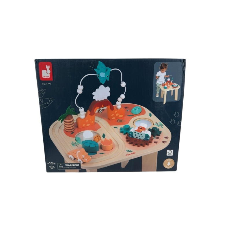 Explore the prehistoric world with the dinosaur activity table! Perfect for little dinosaur fans, this table features a track for pushing the triceratops, a bead maze with a Pteradactlus, and more engaging activities. Ideal for early learning, it stands at the perfect height for young walkers. Part of Janod’s Dino collection, collect all the prehistoric puzzles and toys for endless educational fun.