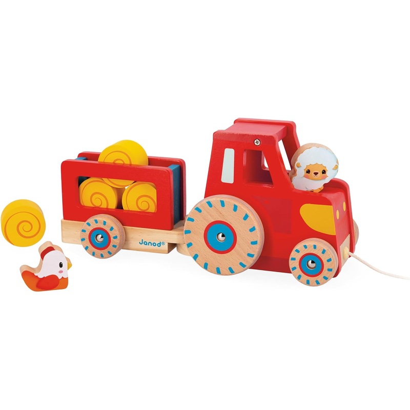 Introduce your little one to the world of farming with this tractor-shaped pull-along toy. Designed for babies 12 months and up, it not only promotes gross motor skills but also sparks their imagination with 6 accessories and endless adventures. With a removable trailer and silent wheels, this educational toy is sure to delight.