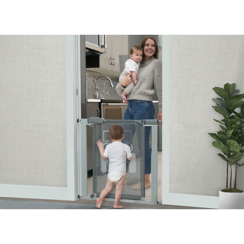 Easily child proof your home with the Jeep Adjustable Baby Safety Gate by Delta Children. This pressure mounted gate requires no hardware or tools to install and exceeds a 30-pound pushout force without damaging your walls (unlike other brands!). The adjustable frame comes with two included extension pieces that allow the gate to fit openings between 28.5 inches and 40 inches effortlessly. This gate helps create child-friendly areas within your home, use it at the bottom of the stairs, doorways or hallways–the pressure mounted design makes it easy to move around the house. Its cool grey metal frame and swing-open door with see-through mesh allows you to keep an eye on your child and walk through whenever needed. The iconic Jeep Wrangler silhouette on the mesh adds a touch of adventure to any space. Great for kids or pets. Stop use when your child can climb over the gate.