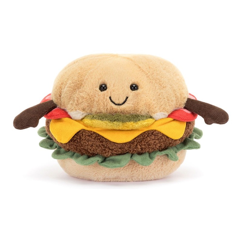 The star of any barbecue bash, Amuseable Burger’s dressed to impress! From top to bottom, this burger’s rocking a brilliant two-tone golden bun, cordy arms, a fluffy green gherkin, suedey yellow cheese and foldy lettuce! Oh yes, and the chunkiest fuzzy burger patty!