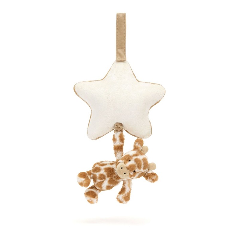 The Bashful Giraffe Musical Pull is a soothing gift to help babies drift off. Jellycat’s most loved giraffe has gorgeous yellow fur with dark orange patches made with recycled fibers and holds on tight to a concertina pull. Gently pull the giraffe and an original Jellycat lullaby will play from the stylishly monochrome trimmed star.