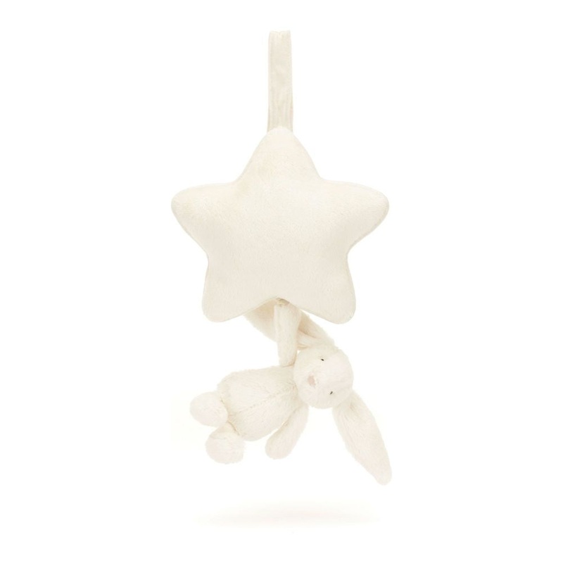 An enchanting newborn gift, let babies dream sweetly with a Bashful Bunny Musical Pull. Jellycat’s most loved Bashful Bunny, in soft fur made from recycled fibres can be gently pulled to hear an original Jellycat lullaby. The cream star shaped musical pull with contrast trim can be attached to a crib or pram with a Velcro fastening