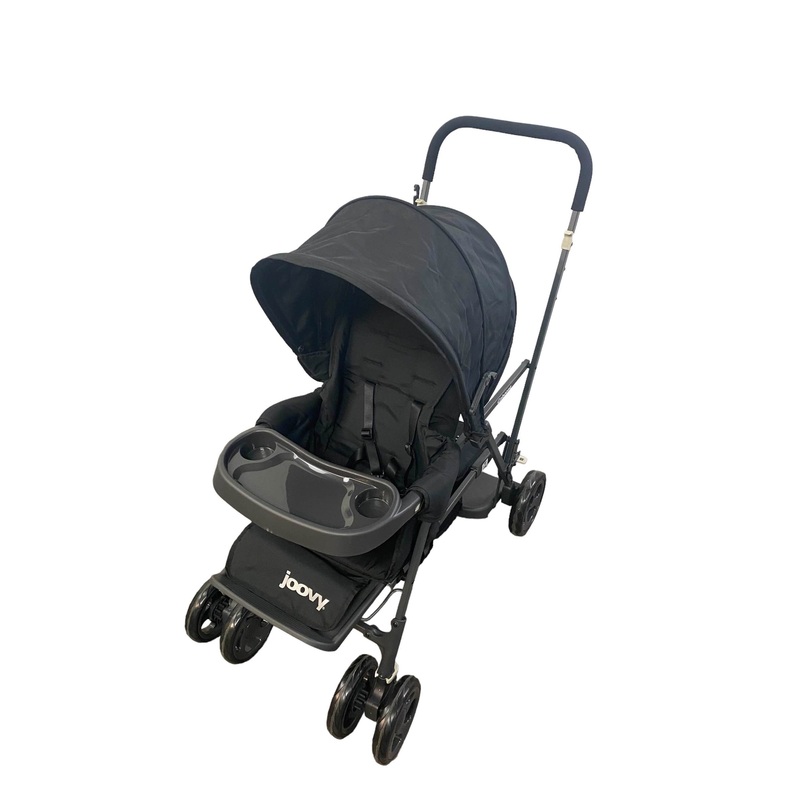 “With two kids, traveling around can be tough, so make your life easier by getting this double stroller. Featuring a full-size, removable rear seat made for kids six-months and up to sit on; a rear stand-on platform for that big kid who doesnt want to sit down anymore; and a bench seat in the back as well. But wait, theres more. The stroller also has the front seat, which can recline or be converted for infant car seat use. Each seat is secured with a five-point harness and has a movable canopy to help protect against elements. Theres a snack tray in the front and the sturdy steel frame will make sure everyone is safe.”