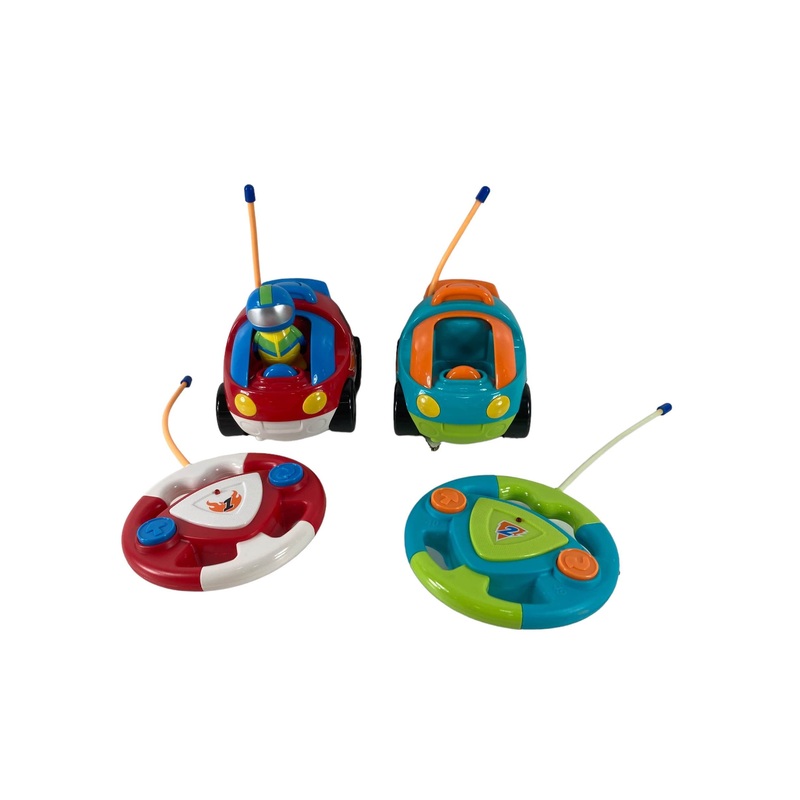 “Set of two colorful remote control car toys for toddlers with music and sound features.”