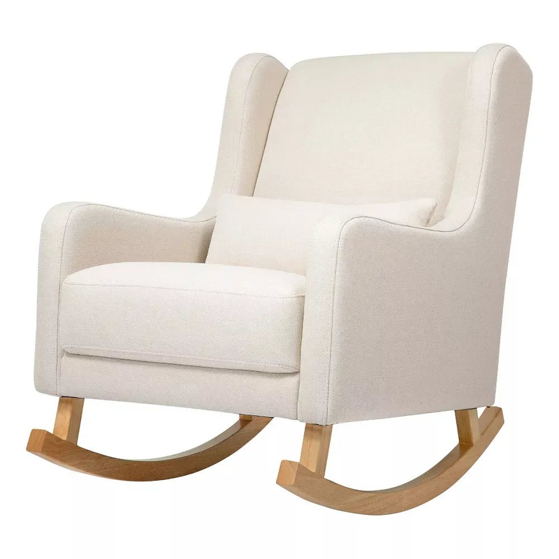 Take a moment to relax in the charming mid-century styled Kai rocking chair. Designed with modern rounded edges, curved rubberwood legs, and included lumbar cushion for added comfort. It’s a stylish but also more sustainable choice for the modern nursery. Upholstered by hand in our eco-performance fabric, that is stain resistant, water repellent, and made with at least 30% recycled fibers.