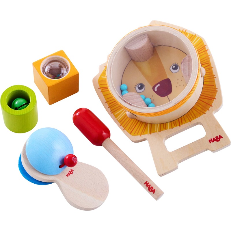 Das Klangspielset Lwenstark von HABA enthlt alles, was kleine Musikanten fr den richtigen Rhythmus brauchen: eine Kastagnette, zwei Akustiksteine und eine Trommel mit Schlgel. Die Lwen-Trommel hat gleich 3 tolle Funktionen. Mit der Hand, den Fingern und de