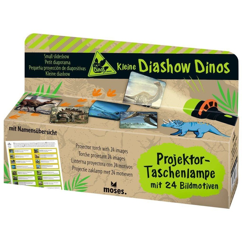 Mit dieser kleinen Diashow von Moses mit Dinosauriern, holen Sie die Urzeitgiganten direkt ins Kinderzimmer.Entdeckt werden knnen insgesamt 24 Bilder zu verschiedenen Dinos, darunter der T-Rex, der Brachiosaurus und Co.Einfach die Projektor- Taschenlampe einschalten, die Bildmotive einsetzten und schon kann es losgehen.Modell: 40236ACHTUNG: Nicht geeignet fr Kinder unter 3 Jahre. Erstickungsgefahr durch verschluckbare Kleinteile.Nicht direkt in die Augen leuchten.