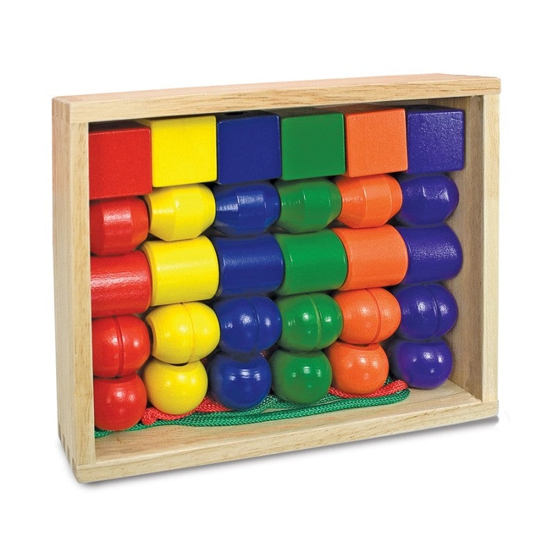 Thirty wooden beads in six vibrant colours and five distinct shapes combine with two extra-long laces for many activities.