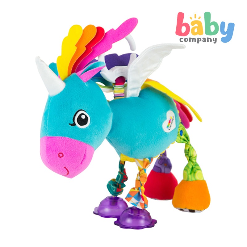 Darcy Darlingmane will magically make her way into baby’s heart. This unicorn has a rainbow ribbon mane and tail plus silvery, crinkle wings that add some sparkle. Cute little clip-clop hooves make trotting noises when they swing about at the end of her knotty legs. The Lamaze clip lets you hook her to strollers, carriers and diaper bags to take her along for fun on-the-go.