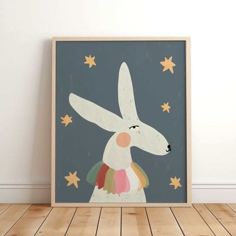 Add a touch of playful charm to your space with the Lara & Kin Boho Bunny Rabbit art print. This delightful illustration features a whimsical bunny adorned with bohemian-inspired details, bringing a fun and stylish vibe to any room. Perfect for nurseries,