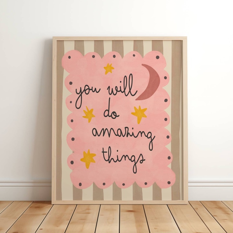Inspire confidence and joy with the Lara & Kin "You Will Do Amazing Things - Pink" art print. This playful design features uplifting words in a cheerful pink palette, perfect for brightening any room with positive energy. Whether placed in a child's bedroo