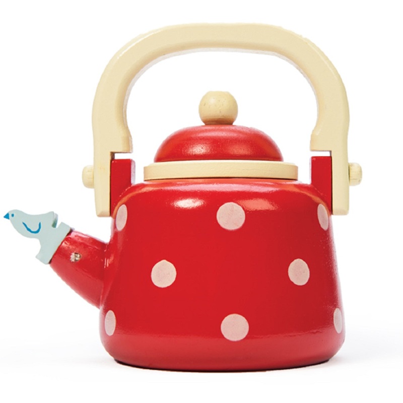 Dotty Kettle from Le Toy Van is just the job for youngsters to make a cuppa in their Le Toy Van Kitchen. The wooden kettle has a removable lid, a fold down handle and a little bluebird whistle in the spout. Painted in a red and white polka dot design it will make a wonderful addition to any childs play kitchen.