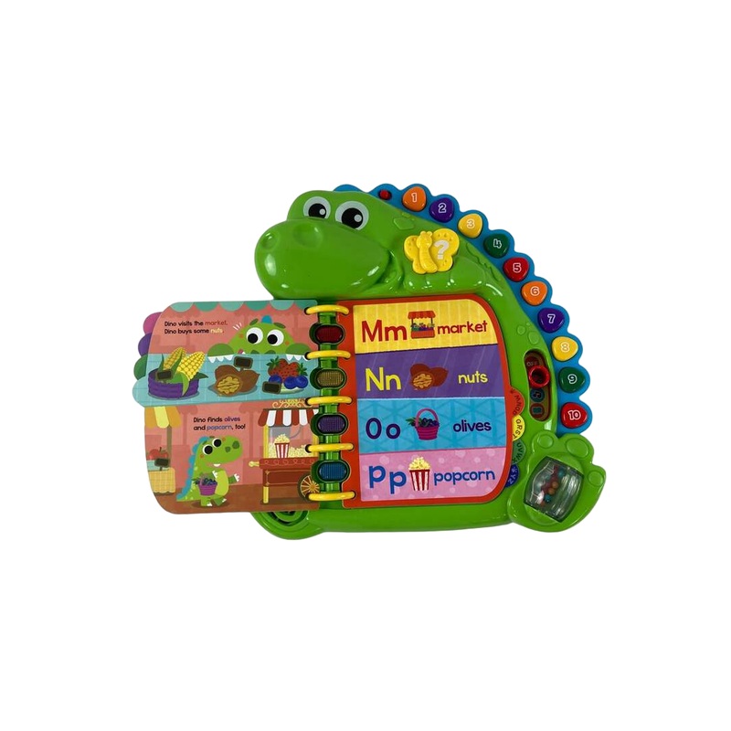 “This electronic book will have your child working out the phonetic sounds of the ABCs with a story and their Dino friend. This book has 16 interactive pages, light up buttons, numbers, and so much more. “
