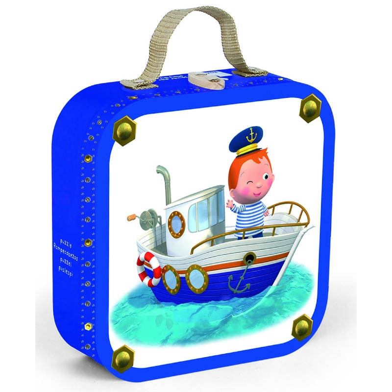 Leo’s Boat Puzzle is a delightful set of 4 Jigsaw puzzles in a Suitcase made by the French toymaker Janod. All the puzzles are the same size but the number of pieces varies so that the difficulty increases. The first puzzle consists of 6 pieces, the next 9, then 12 pieces and finally 16 pieces. Each puzzle depicts a different picture of Leo out fishing and in his boat. The puzzles come in a wonderfully illustrated suitcase style box with a fabric carrying handle.