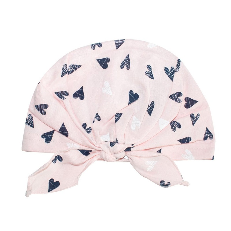 A beautiful light pink beanie with a knot and hearts pattern made of soft material is a great addition to your childs everyday outfit. The product is also an excellent choice for colder and windy days.