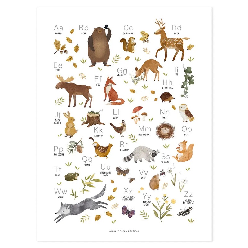 Add an adorable woodland touch to your nursery with Lilipinso’sbeautiful art print featuring all the differentwoodlandspecies. Your little one will go wild for this awesome print. Featuring a range of beautifully illustrated woodland animals and elements in a variety of colours withtypography to help your little ones learn thealphabet.