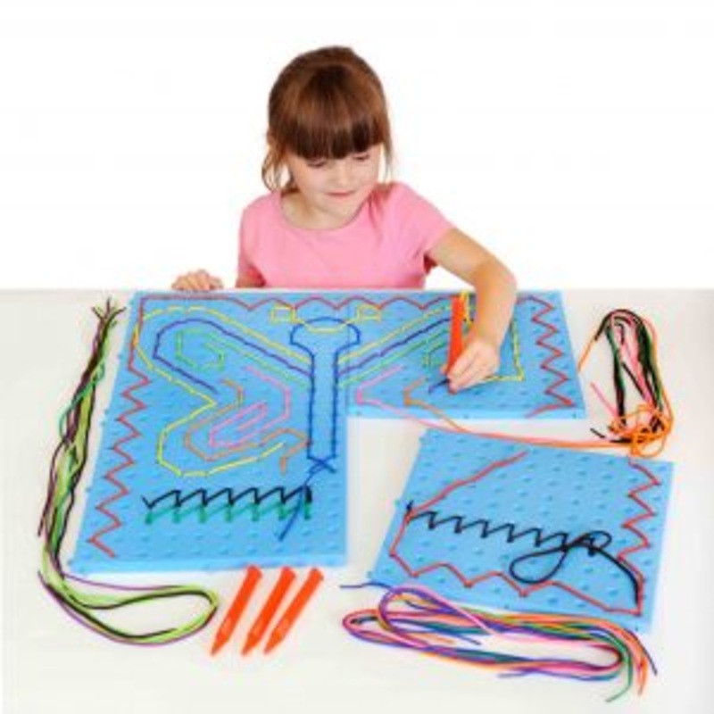 Threading the laces into the board with the triangular applicator, is designed to develop the muscles in the fingers and hand associated with handwriting.