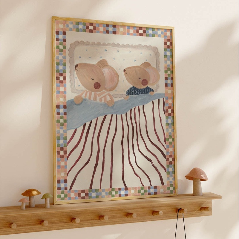 Transform your child's room into a whimsical wonderland with this hand-painted print. The charming pastel checkerboard border and peacefully sleeping mice will add warmth and coziness to their space. Enhance their sense of wonder and comfort with this uniq