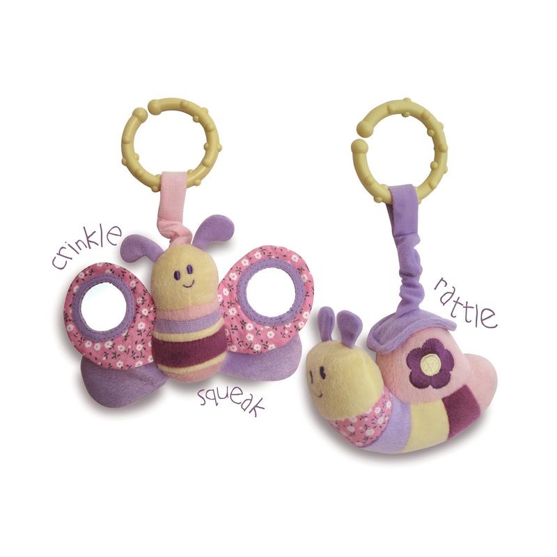 Little Bird Told Me Rattle and Squeak Set Butterfly and Snail toy will keep baby entertained while on the go. The set consists of two versatile activity toys that rattle and squeak! The textured teething rings attach to cots, pushchairs, car seats and baby gyms.