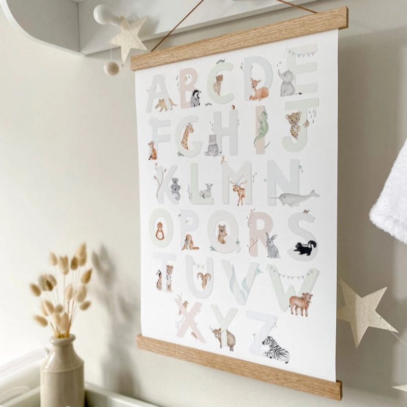 Gorgeous, watercolour artwork outlines the 26 letters of the alphabet on this incredible fine art print from UK based brand Little Roglets, with original animal designs peeking out from behind each letter to provide friendly faces that encourage learning. The gender-neutral colour palette of the artwork means that it is perfect for any child’s room – as long as they love animals!