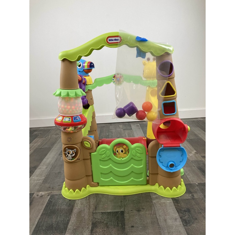 “Babies and toddlers will love to play, learn and explore in their very own treehouse. It features so many activities such as a ball ramp, shape sorting mailbox, monkey on a rope, crawl through arch, lights, and so much more! even has a swinging door. For ages 6-36 months.”