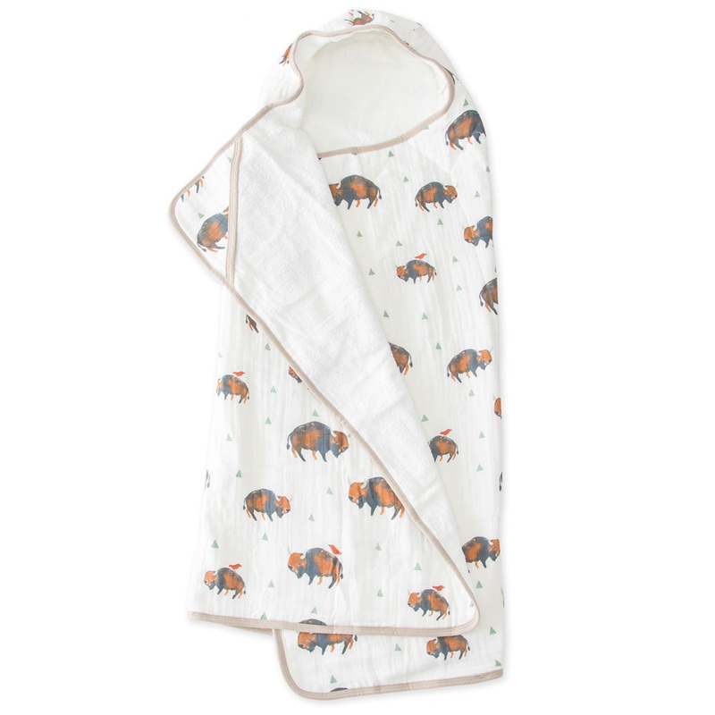 Bath towel with printed cotton muslin on one side and ultra-soft terry cloth on the other; a cozy hood and pockets for little hands.