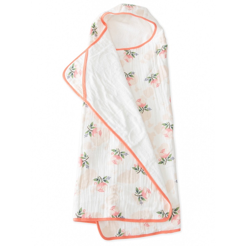 Bath towel with printed cotton muslin on one side and ultra-soft terry cloth on the other; a cozy hood and pockets for little hands.