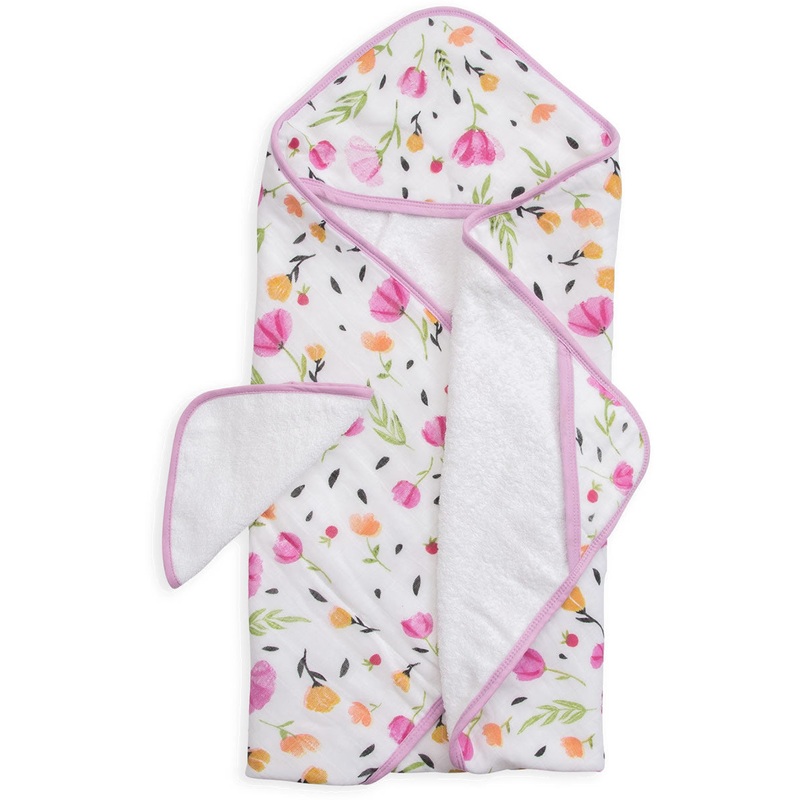 Clean and warm. Bath towel with printed cotton muslin on one side and ultra-soft terry cloth on the other; a cozy hood and pockets for little hands. 1 hooded towel and 1 washcloth Fully printed cotton muslin back quilted with fluffy terry cloth Towel: 33"