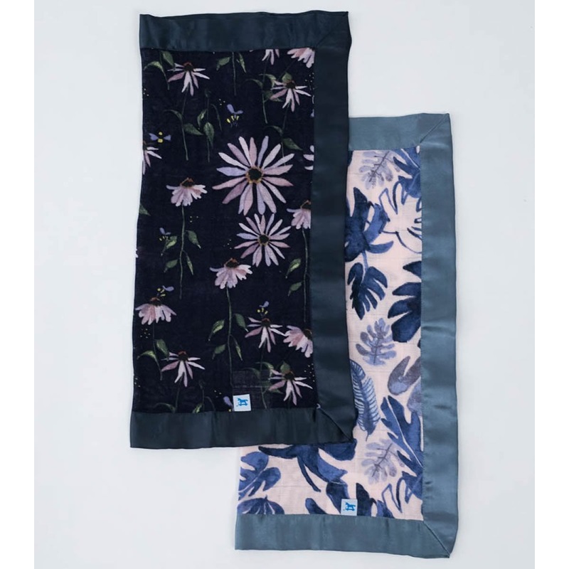 Two 16" x 16" security blankets 100% cotton muslin Small size to soothe and comfort Practical for packing Softer with each wash Satin border Original prints to fit your unique style