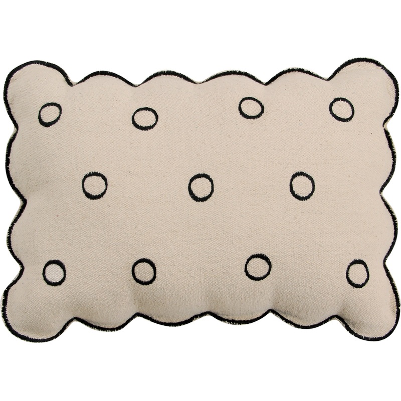 Inspired by the classic biscuit, it integrates perfectly into settings with well-defined and contemporary lines. A cushion in the shape of a biscuit, made of compact 100% cotton fabric and 100% polyester stuffing, the base is of undyed natural cotton color. Circles in the form of little holes have been embroidered while the edging forms the curves of the biscuit, all in black. It works very well in children’s rooms, but also for living rooms, couches, armchairs, hammocks, on the floor, bedrooms, etc. It is washed in the washing machine without having to be uncovered and is child-friendly because it lacks zippers and buttons. It combines perfectly with Bereber and Trace rugs and the Baby wall hanging.