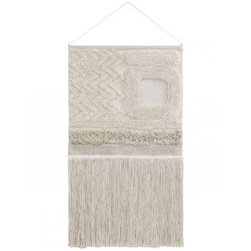 Synonymous with style and elegance in Natural colour. Give a different touch to your stay with the Early hours wall pendant! A base of canavas with different textures and large cotton fringes at the bottom. Size: 2’10” x 1’8″.