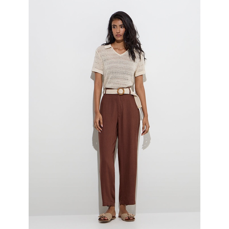 This beige top from LOV is woven from a cotton-blend fabric, featuring a stylish knit-texture design. Designed with a V-neck collar and half sleeves, it offers a breathable feel, making it a versatile piece for relaxed summer days.