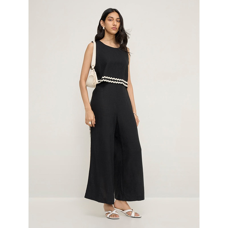 This black jumpsuit from LOV is fashioned with contrast detailing for added appeal. Spun from a linen-blend fabric, it includes a round neck and sleeveless cut.