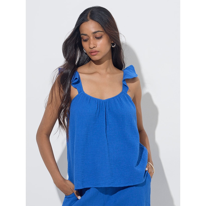 LOV brings you this crinkle-textured top in a vibrant blue shade. Milled from a lightweight fabric garment, it showcases a subtle sweetheart neckline and ruffled sleeves.