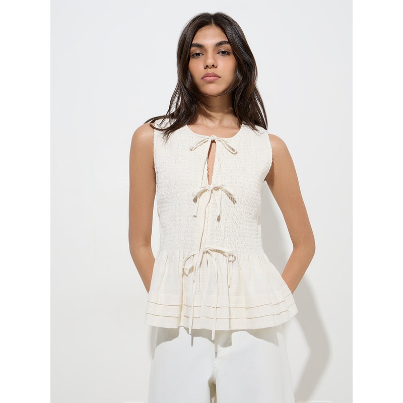 LOV brings this off-white top designed in a peplum frame, featuring a smocked texture and a tie-up front. Woven from cotton-blend fabric for lasting comfort, it lends an effortlessly elevated flair to both casual and dressy looks.