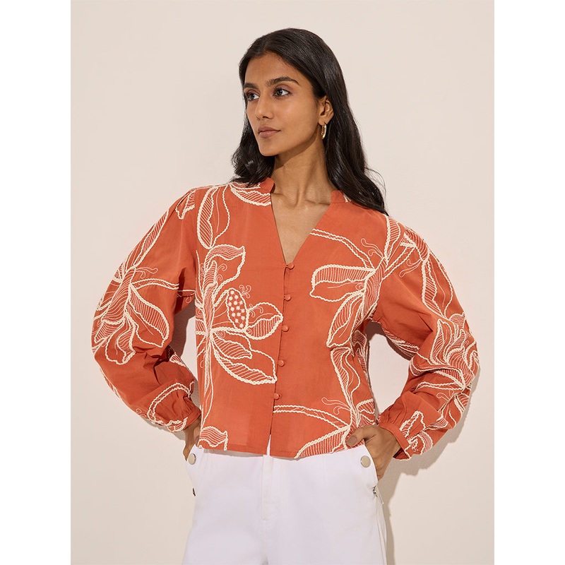 This orange top by LOV is designed with captivating floral embroidery. Made from breathable fabric, it offers a mandarin collar, button down front and full sleeves.