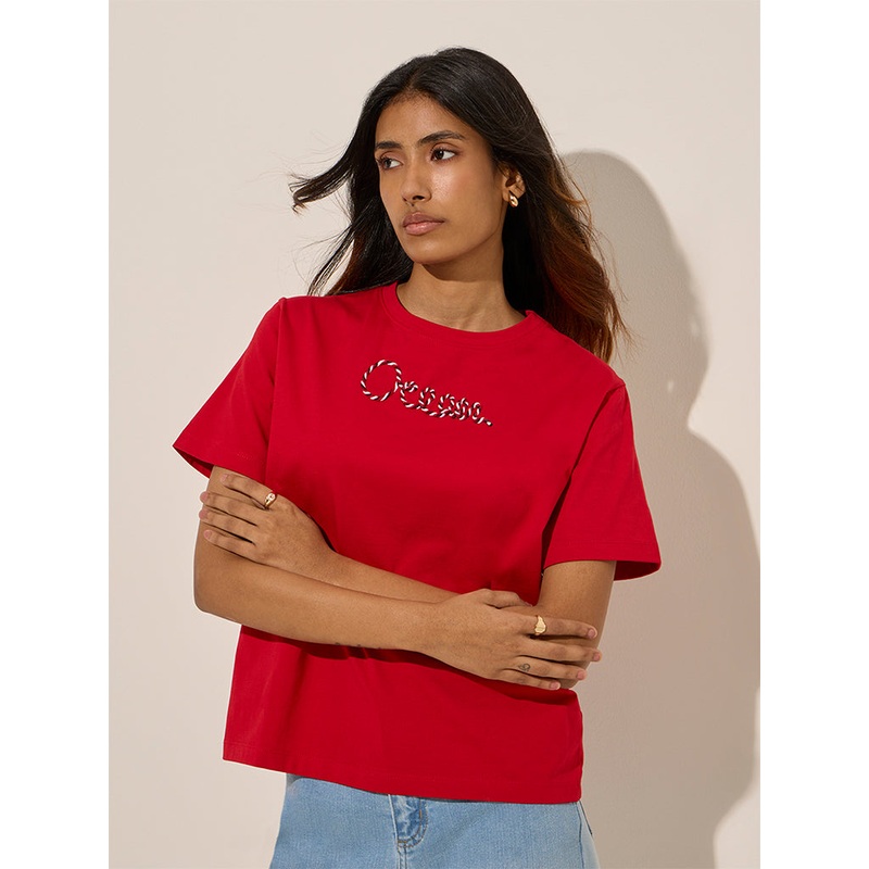 This red t-shirt by LOV flaunts text designs at the front. Made from pure cotton, it includes a crew neck and short sleeves.