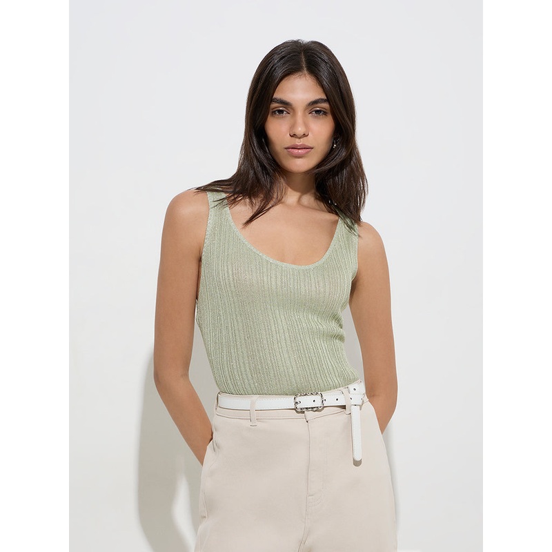 This sage top from LOV features a shimmering finish over a self-striped textured base. Woven from lightweight fabric, it is designed with a scoop neck and a sleeveless profile, making it a stylish choice for chic summer occasions.