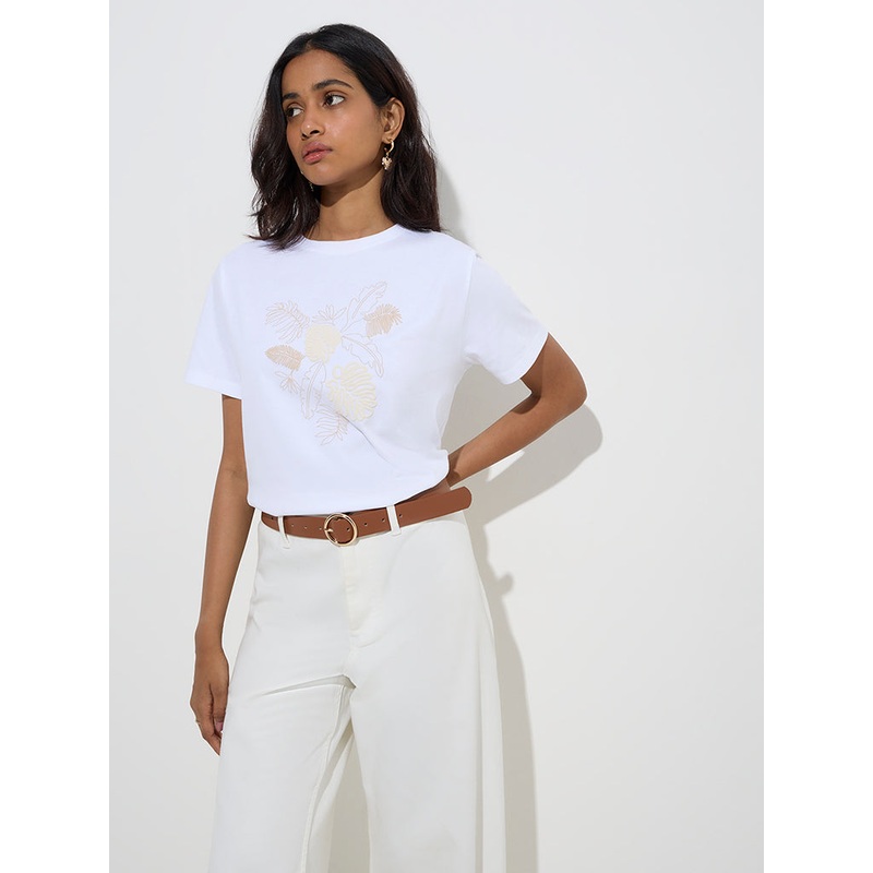 This pure cotton t-shirt from LOV features a white base with delicate floral embroidery. Designed with a crew neck and short sleeves, it offers breathable comfort throughout the day.